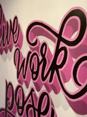 I was asked to visualise 'Live Work Pose' a popular phrase from a tv series for a client who reached out on my website. This was painted on an interior wall in a stairwell so had to look impactful from both angles.